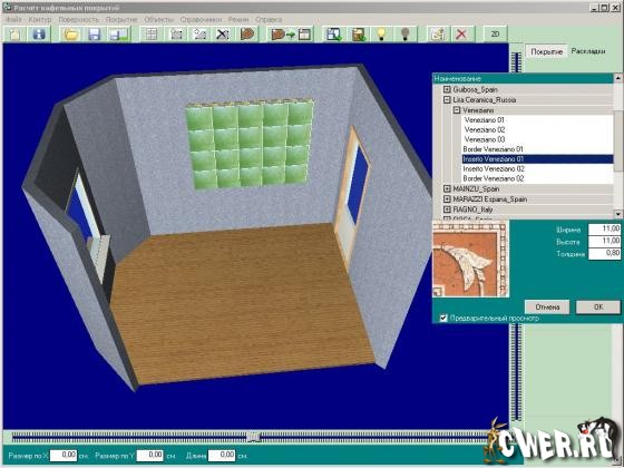Программа Кафель 4.0 предназначена для создания графических изображений помещений, стены, пол и потолок которых можно покрыть различными покрытиями, которые находятся в справочнике. При этом можно рассчитать сколько обоев, ламината, линолиума или кафеля пойдет на облицовку стен, вычислить площадь покрываемой поверхности, необходимого количества клея и расшивочной смеси.