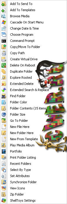 ShellToys XP - это почти пять десятков расширений, становящихся доступными через контекстное меню Проводника - хватит для всех мыслимых случаев и даже чуточку останется про запас: медиа-информация о файле, выбор по типу, шифрование / дешифрование, копировать / переместить в..., удалить безвозвратно, разделить / склеить файл, проиграть избранные аудиофайлы, распечатать список файлов в папке и т.д. и т.п.. Есть даже такая опция, как показ по правому клику уменьшенной картинки графического файла.