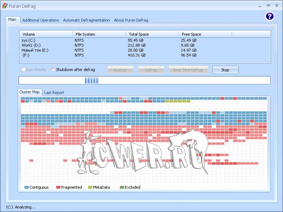 Puran Defrag - это высокоскоростной дефрагментатор, обладающий необычайно простым и удобным интерфейсом, а также некоторыми необычными функциями. Необычность включает в себя не только непривычно удобный интерфейс, но и сама технология дефрагментации, которая заключается, как в полной дефрагментации дисков, или отдельных ее файлов из простого контекстного меню, так и размещение часто употребляемых файлов в область более быстрого доступа, что как и понятно, существенно увеличивает производительность. Даже если для полной дефрагментации файла не хватает места, программа использует все имеющиеся ресурсы и дефрагментирует файл, насколько это возможно. Данный дефрагментатор идеально подойдет для тех пользователей, кому некогда, а обслуживать систему все равно надо. Имеет очень простой интерфейс, который не вызовет каких-либо проблем при использовании данной программы.