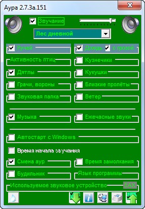 "Аура" — это программа, которая создает на вашем компьютере звуковую атмосферу дневного и ночного леса. Достаточно одного щелчка по значку, чтобы выключить или включить воспроизведение. Пульт управления, вызываемый правым кликом по значку, позволяет настроить активность птиц, цикад, ручья, водопада, дождя, грома, костра, зверей, флейты, гитары, скрипки, виолончели, назначить автоматическую смену аур (с заданной периодичностью или в соответствии с временем суток), задать автоматический старт программы при включении ПК, выбрать автоматическое выключение компьютера в заданное время (для любителей засыпать под умиротворяющие звуки леса).