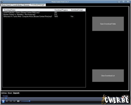 MusicTuner бесплатно осуществляет поиск MP3 в Интернете для последующей загрузки или воспроизведения. В программе есть стандартная библиотека и веб-браузер, создаются плей-листы. MusicTuner пригодится всем, кто не нуждается в обилии функций и щепетильно относится к системной производительности.