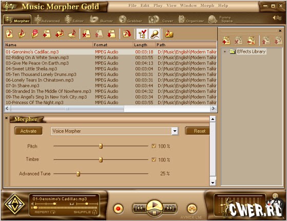 Кроме того, AV Music Morpher Gold включает программу записи MP3 и устройство автоматической смены дисков. В отличие от других MP3 проигрывателей, таких как Winamp, MusicMatch, RealPlayer или Windows Media Player, Music Morpher Gold может проигрывать и изменять музыку в режиме реального времени. Смеситель эффектов и библиотека эффектов разработаны для ваших разнообразных вкусов. Этот комплект инструментов также работает как MP3 конвертер, очень полезный в преобразовании MP3 в WAV, WMA или в любой из 10 поддерживаемых форматов музыки. Music Morpher Gold an easy CD creator поставляется с: CD ripper для записи звуковых дорожек на жесткий диск, устройством записи для записи аудио компакт-диска, компакт-диск с данными и DVD данными, дизайнером обложек для проектирования обложек для компакт-дисков и DVD. Мультиформатный аудиопроигрыватель поддерживает форматы MP3, MP2, WMA, WAV, APE, OGG, AU, IRC. AV Music Morpher Gold - лучший выбор для запуска дорожек в различных форматах, особенно музыки, загруженной из различных file sharing систем, таких как Kazaa, iMesh, eMusic, Napster, and Music Net. Music Morpher Gold совместим с караоке. Music Morpher Gold идеально подходит для оперативной трансформации музыки, смешивания музыки, создания заказного CD, караоке CD, звуковой дорожки и аудио клипов.
