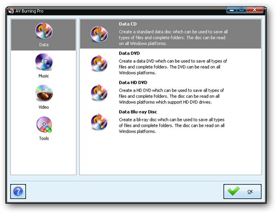 AV Burning Pro - мощная программа для граббинга, записи и создания CD, DVD, Blu-Ray and HD-DVD дисков. Она поддерживает все типы оптических носителей, включая CD-R/RW, DVD-R/RW, DVD+R/RW, BD-R/RE, HD-DVD-R/RW и DVD-RAM, а также огромное количество записывающих устройств.