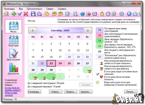 4WomenOnly - очень удобный и простой в использовании ежемесячный индивидуальный календарь менструальных циклов для женщин. Это одна из самых мощных систем для заботы о здоровье женщин. С помощью программы Вы сможете определить дни менструальных циклов, овуляций и дней, безопасных для занятий любовью, дабы избежать нежелательной беременности. Календарь поможет Вам использовать естественный метод контрацепции. Он обозначит дни с большей вероятностью беременности, а также поможет попытаться предсказать пол и дату рождения Вашего будущего ребенка. В календаре есть система напоминаний и ежедневного сбора информации о Вашем состоянии, календарь, статистика, возможность экспорта результатов и вывода их на печать, защита паролем и много других полезных функций.