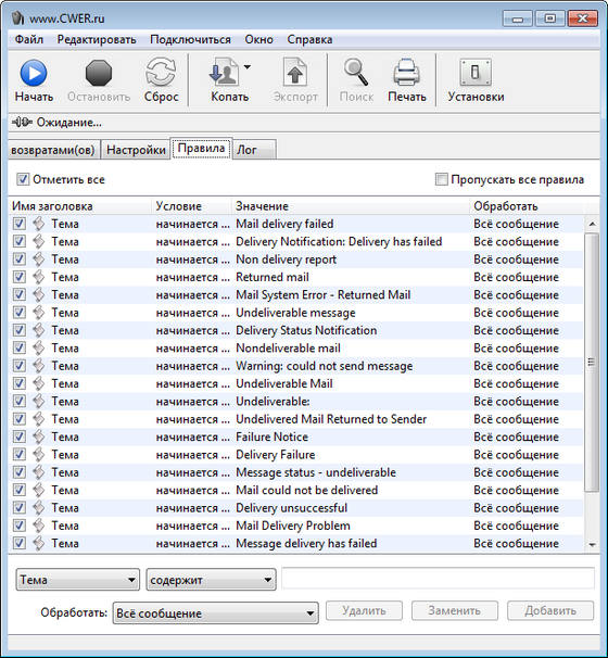 eMail Bounce Handler – инструмент для фильтрации и обработки вернувшихся писем. Программа способна распознавать возвраты способом, определяемым настройками, а также извлекать адреса получателей, что дает вам возможность повторно отправить сообщение или удалить неудачный адрес из списка рассылки. Программа умеет обрабатывать любые возможные источники, содержащие письма-возвраты: локальные файлы, локальные и удаленные почтовые ящики, отрывки текста, а также буфер обмена. В ситуациях удаленного доступа программа поддерживает как POP, так и IMAP протоколы, отслеживая возвраты и никак не затрагивая другие сообщения. В результате обработки писем-возвратов вы получаете список «плохих» адресов, который вы можете использовать для очистки имеющегося у вас списка рассылки или для повторной отправки сообщения. Обладает многоязычным интерфейсом с поддержкой русского языка.
